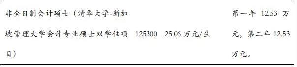 非全日制会计硕士(高级财务管理与大数据硕士项目)学制为2年,学费为29.8万元/生;非全日制会计硕士(清华大学-新加坡管理大学会计专业硕士双学位项目)学制为2年,学费为25.06万元/生。