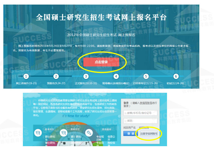 1.开始报名,登陆2017全国硕士研究生招生考试网上报名平台http://yz.chsi.com.cn/yzwb/ 点击“ 点击登陆 ”号跳转至登陆页面,所使用的账号 为学信网账号,若无则需申请; 请牢记学信网的用户名密码,后期准考证 下载、调剂仍然需要使用。