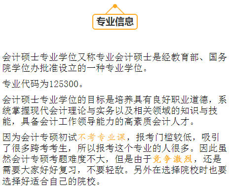 会计专硕因为不考专业课,而且就业较好,所以是考研的热门专业。但在报考前,你还需要对专业和院校了解更多,才能选出最适合自己报考的院校。下面小编就来介绍以下会计专硕的专业信息和院校信息。