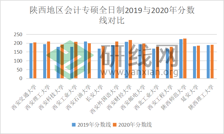| 陕西地区会计专硕全日制2019与2020年分数线对比 | ||