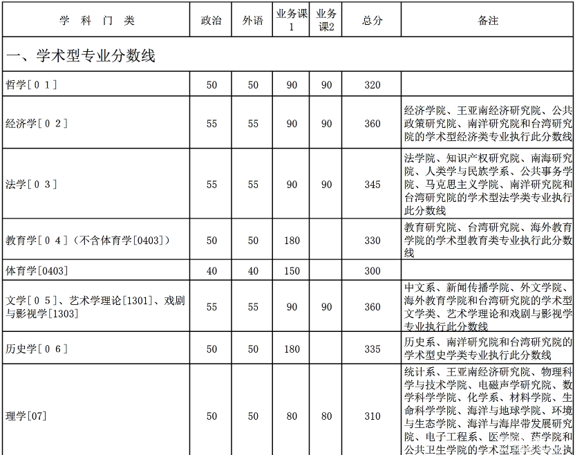 厦门大学2017年硕士研究生招生复试资格基本线:工商管理(MBA)a线[1251]:190/110/55;工商管理(MBA)b线[1251]:170/100/50;工商管理(MBA)提前面试获得良好资格考生分数线[1251]:国家A类地区MBA分数线;公共管理(MPA)[1252]:180/100/50;会计[1253]:190/100/50。具体如下: