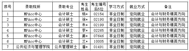 我校拟录取的会计学院非全日制会计硕士杨*(考生编号后五位02154)等7名硕士研究生因个人原因放弃拟录取资格,现递补录取考生7名,特进行公示。