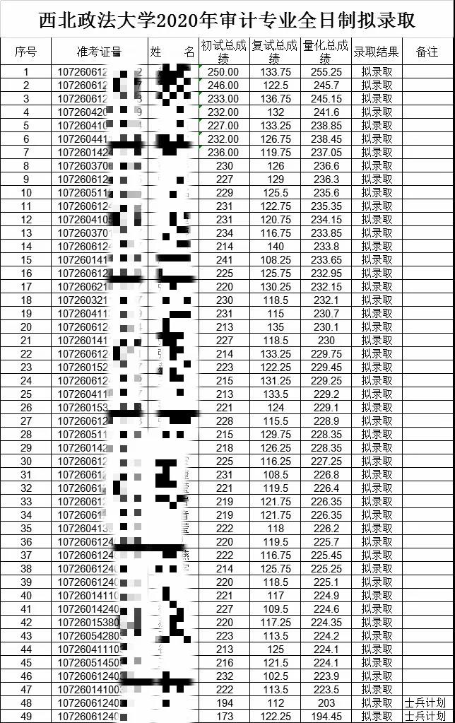 审计专业(全日制)共录取60人(含士兵计划2人)。拟录取最低分209分,最高分250分,平均分219分。