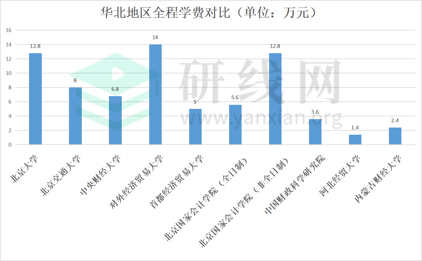华北地区全程学费较低的三所院校有:河北经贸大学学制2年、学费1.4万元,内蒙古财经大学学制2年、学费2.4万元,中国财政科学研究院学制2年、学费3.6万元。