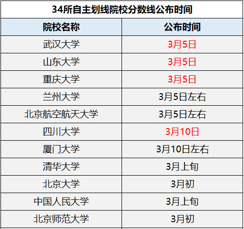 3月15日发布的除了国家线,许多同学们最关心的就是34所自主划线院校的出分时间了。小编查阅了多所院校的研究生院官网,大部分学校并没有给出明确的时间。有四所院校已经给出明确时间:武汉大学、山东大学、重庆大学、四川大学。