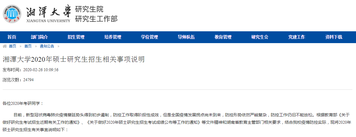 受疫情影响,2020年复试工作迟迟未开启,但是各大高校公布了相关硕士研究生招生的通知公告。广大考生应关注所报考院校的研究生院发布的通知公告,及时了解复试和调剂等工作进展情况,有利于考生更好的准备接下来的复试或是调剂。今天小编给大家整理的是“湘潭大学2020年硕士研究生招生相关事项说明”,希望对你有所帮助!